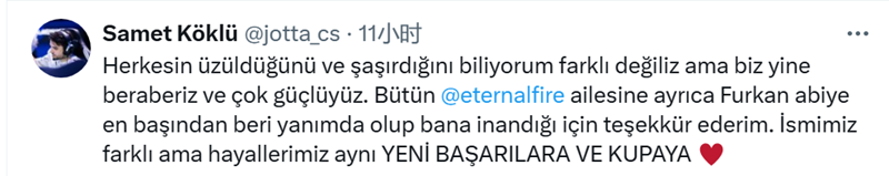jottAAA:我知道每個人都很悲傷和驚訝,我們并沒有什么不同,但我們?nèi)匀辉谝黄穑覀兎浅?jiān)強(qiáng)。我要感謝整個EF大家庭以及Furkan abi從一開始就支持我并相信我。我們的名字不同,但我們的夢想是相同的——新的成功和獎杯。