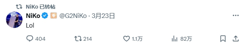 賽后NiKo轉(zhuǎn)發(fā)了自己3月23日的動態(tài):哈哈哈。