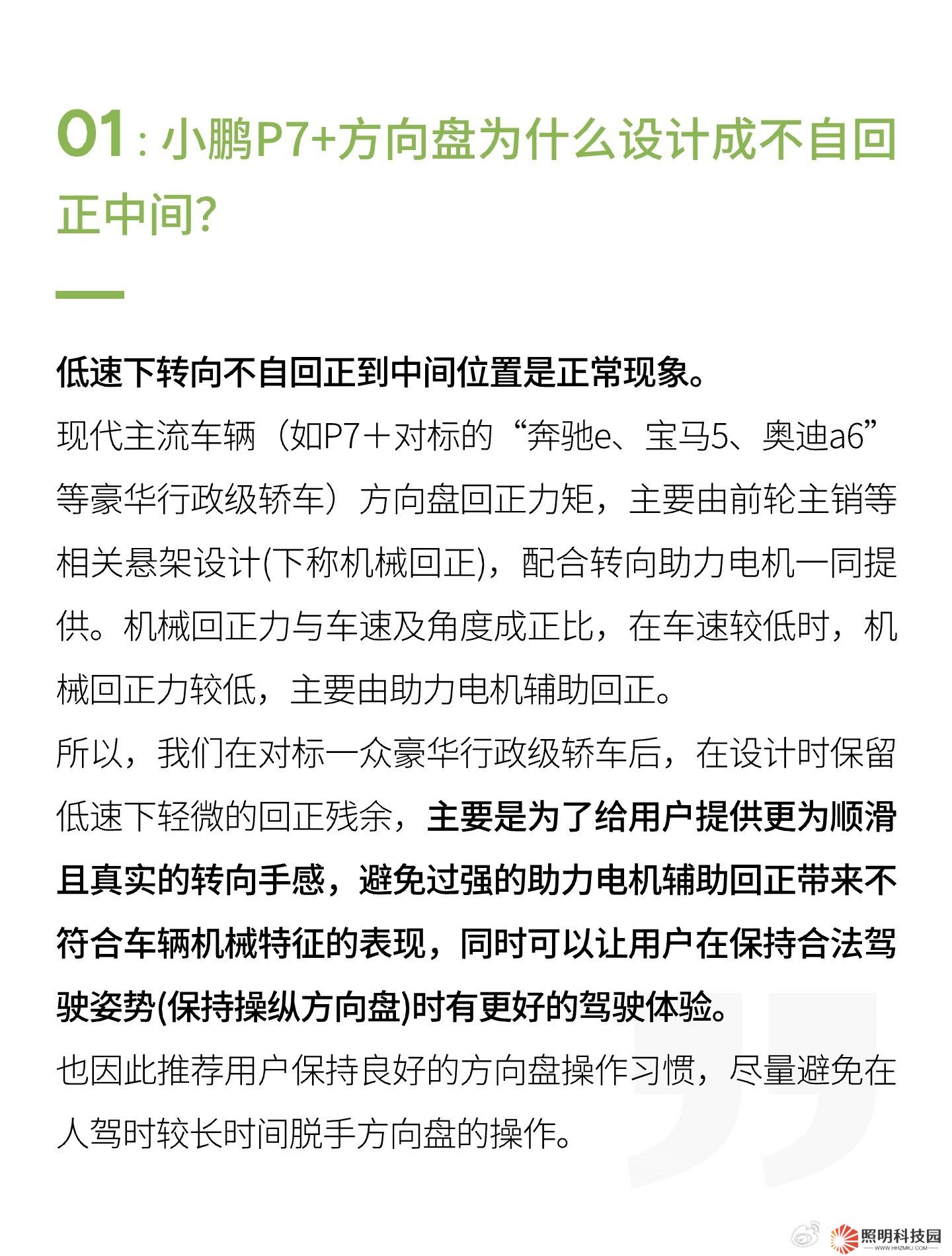 所以,我們在對標一眾豪華行政級轎車后,在設(shè)計時保留低速下輕微的回正殘余,主要是為了給用戶提供更為順滑且真實的轉(zhuǎn)向手感,避免過強的助力電機輔助回正帶來不符合車輛機械特征的表現(xiàn),同時可以讓用戶在保持合法駕駛姿勢(保持操縱方向盤)時有更好的駕駛體驗。也因此推薦用戶保持良好的方向盤操作習慣,盡量避免在人駕時較長時間脫手方向盤的操作。