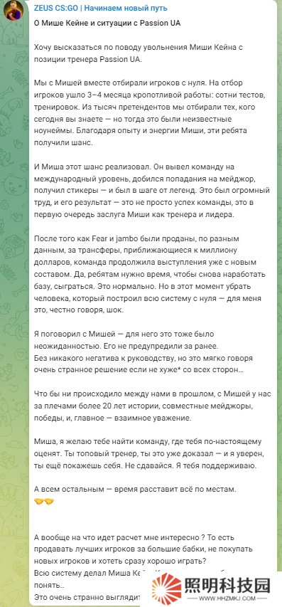 Passion UA戰(zhàn)隊官宣主教練Kane離隊后,前CS職業(yè)選手,Kane的老隊友Zeus在個人社交媒體賬號上就此事發(fā)表了評價。