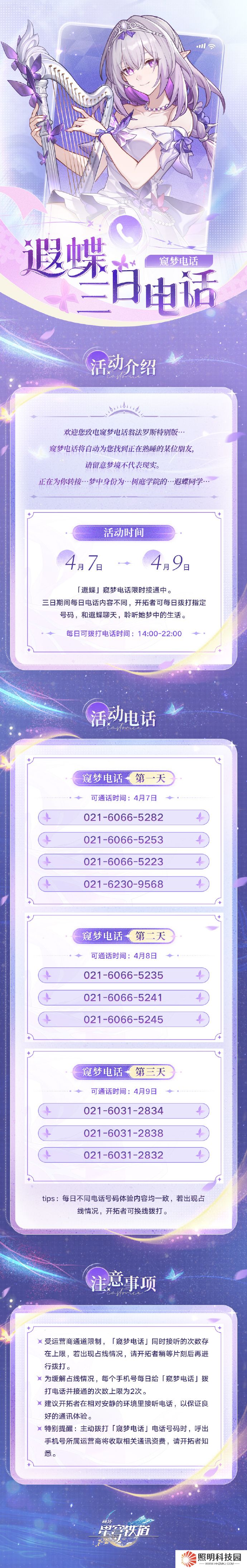 「遐蝶」窺夢(mèng)電話限時(shí)接通?;顒?dòng)期間,開拓者可撥打指定電話號(hào)碼,和遐蝶聊天、聆聽(tīng)她夢(mèng)中的生活。