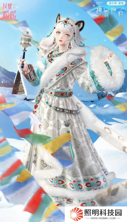 夜宵·拂雪隱豹設(shè)計(jì)理念和思路:若健碩的長尾足以掃除千年不化的積雪,那是否能破開凍土中的沉疴舊俗?夜宵披上紋樣繁復(fù)的外袍踏出神廟,于重山之上,她望見了自己,也望見了所有不被拘束的生命。