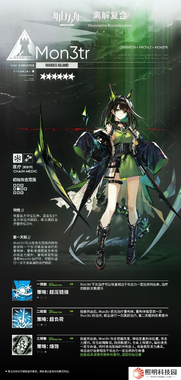 二技能:技能開啟后,Mon3tr會優(yōu)先治療重構(gòu)體,重構(gòu)體每受到一次Mon3tr的治療,就會進(jìn)行一次跳躍治療,第二天賦的效果提升。