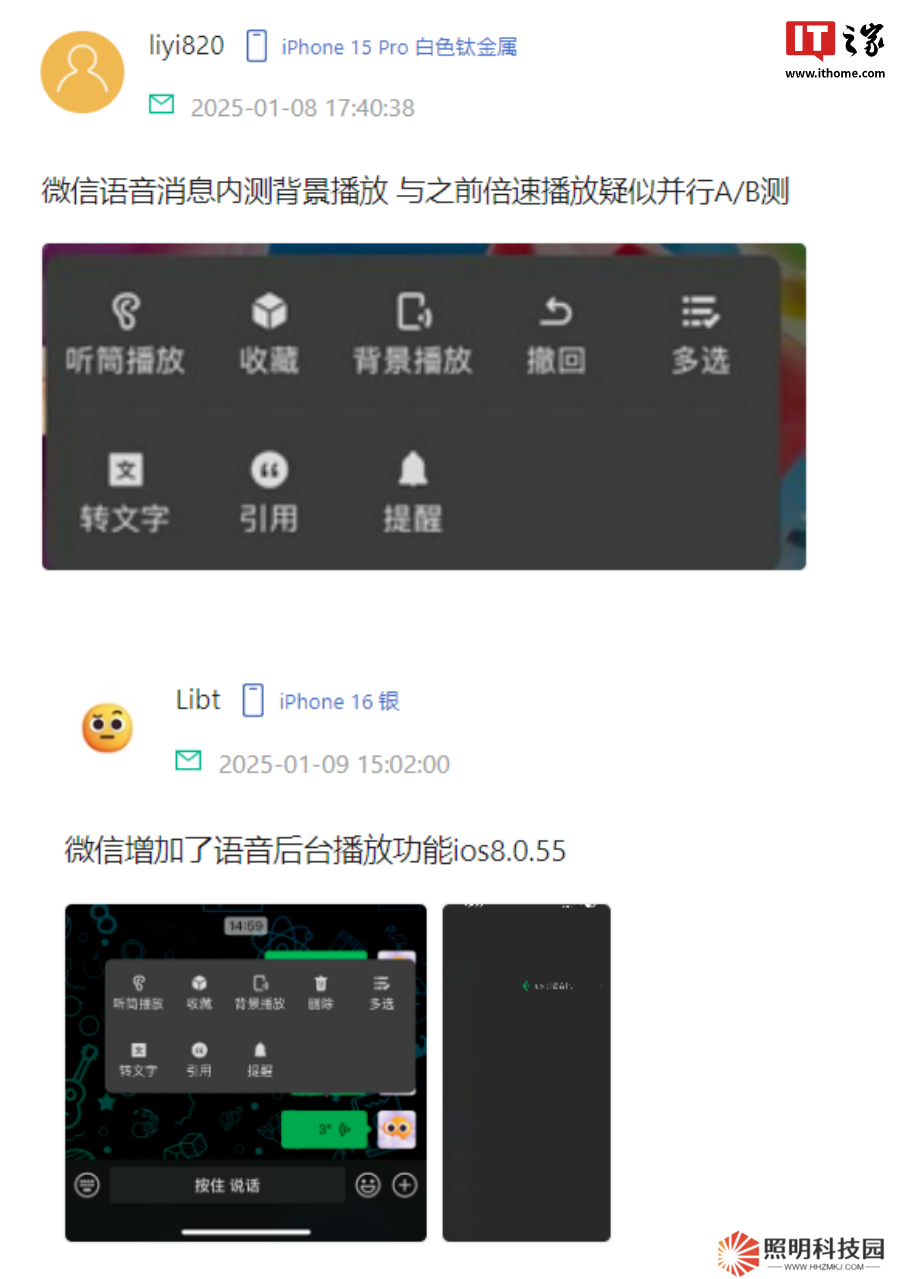 從兩位家友曬出的截圖來看,長按語音消息,彈出的選項中新增“背景播放”,點擊后語音將掛在后臺播放。