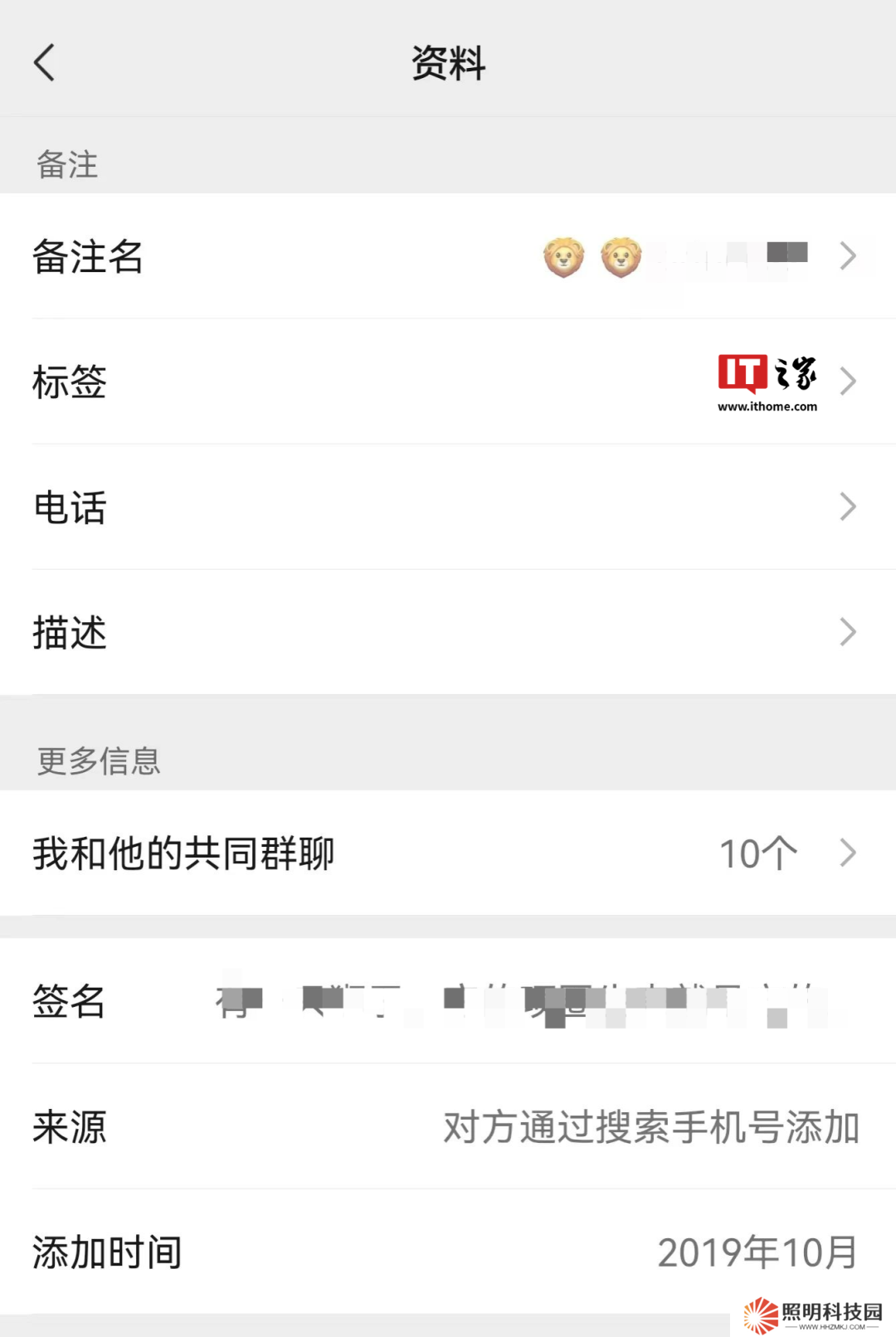 其中,備注包括:備注名、標(biāo)簽、電話、描述;更多信息包括:我和他的共同群聊、簽名、來源、添加時間。
