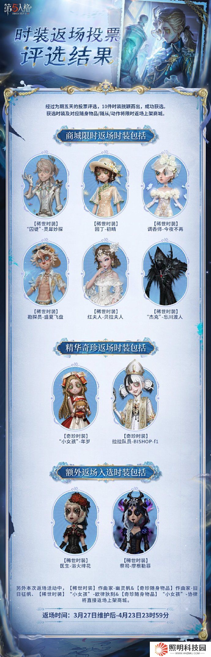 第五人格皮膚返場投票結(jié)果終于出來了,經(jīng)過了5天的投票,大家選出了最終的返場皮膚,那么究竟都有哪些皮膚返場呢?下面快跟隨本站小編一起來看看第五人格返場皮膚有哪些吧。
