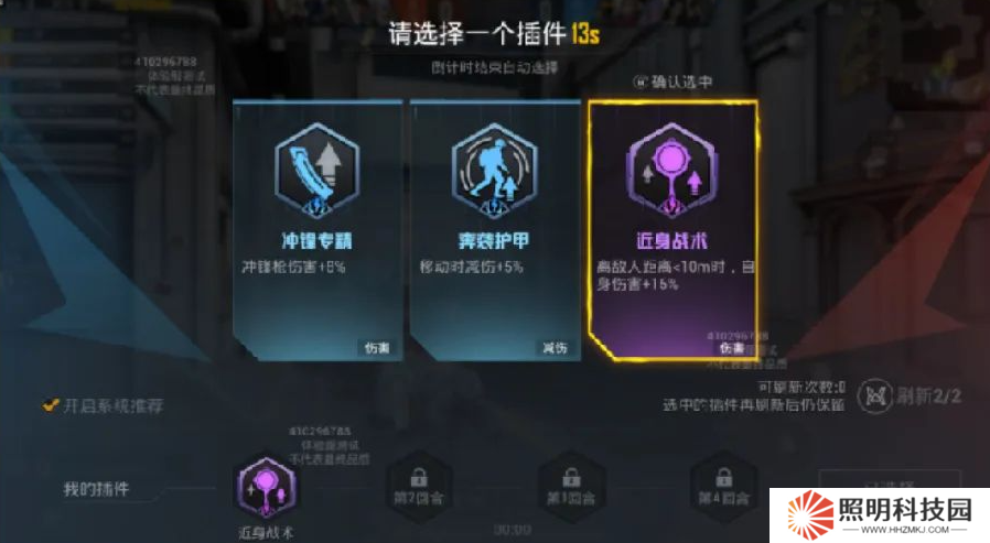 在每回合正式開始前,特種兵都需要先選擇隨機刷新的插件。如果對現(xiàn)有插件不滿意,特種兵也可以通過消耗刷新次數(shù)來重置插件。刷新次數(shù)將根據(jù)特種兵在上回臺中的表現(xiàn)給予一定的數(shù)量,特種兵表現(xiàn)越好,獲得刷新次數(shù)也越。需要注意的是,特種兵最多可以裝配4個插件。