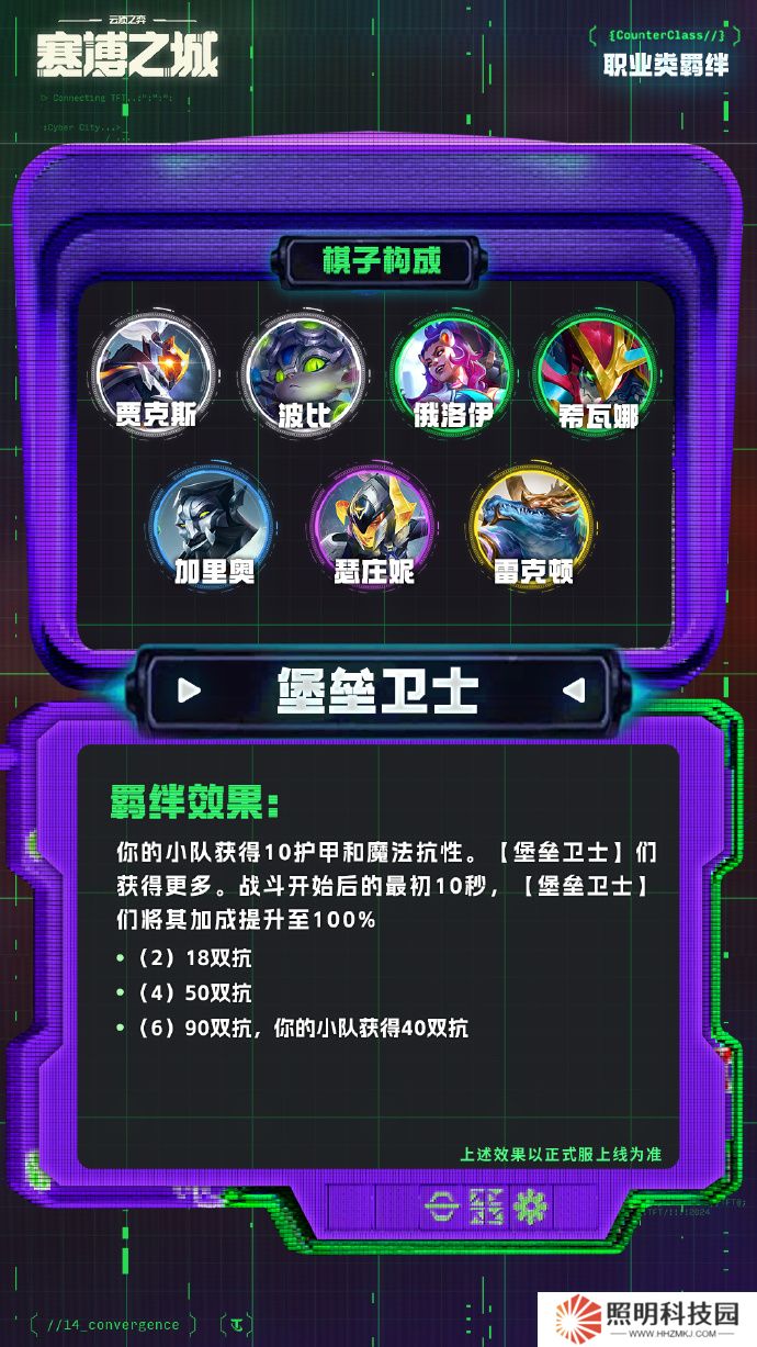 你的小隊獲得10護甲和魔法抗性。【堡壘衛(wèi)士】們獲得更多。戰(zhàn)斗開始后的最初10秒,【堡壘衛(wèi)士】們將其加成提升至100%