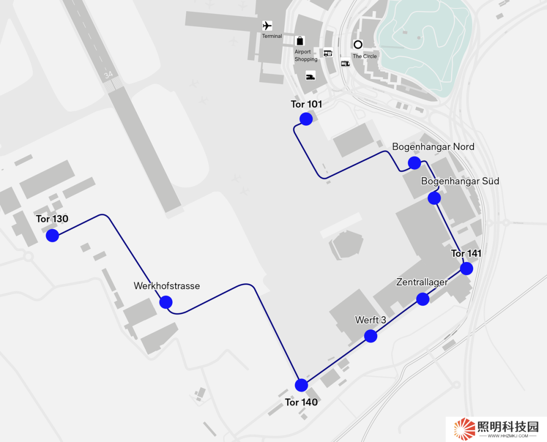 落地蘇黎世機場的文遠小巴每輛最多可容納 9 位乘客,補充現(xiàn)有為機場內(nèi)各公司員工服務(wù)的班車線路,為其提供更便捷的通勤接駁服務(wù)。運營路線將從機場 101 號門員工入口延伸至 130 號門維修區(qū)域,覆蓋機場內(nèi)部非滑行區(qū)域的多個站點。該路線完全獨立于機場飛行運營區(qū)域之外,是無人駕駛在機場應(yīng)用的最佳測試線路,同時可確保運行的安全性和獨立性。