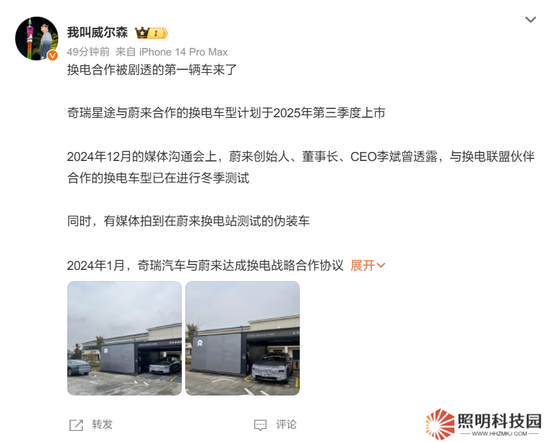 本站 1 月 9 日消息,奇瑞星途與蔚來合作的換電車型今日在行業(yè)曝光。據(jù)財(cái)聯(lián)社援引知情人士消息稱,該車型計(jì)劃于 2025 年第三季度上市。對(duì)此,蔚來方面表示:“目前與各品牌換電合作順利推進(jìn)中。”2024 年 12 月,蔚來創(chuàng)始人、董事長(zhǎng)、CEO 李斌曾透露,與換電聯(lián)盟伙伴合作的換電車型已在進(jìn)行冬季測(cè)試。